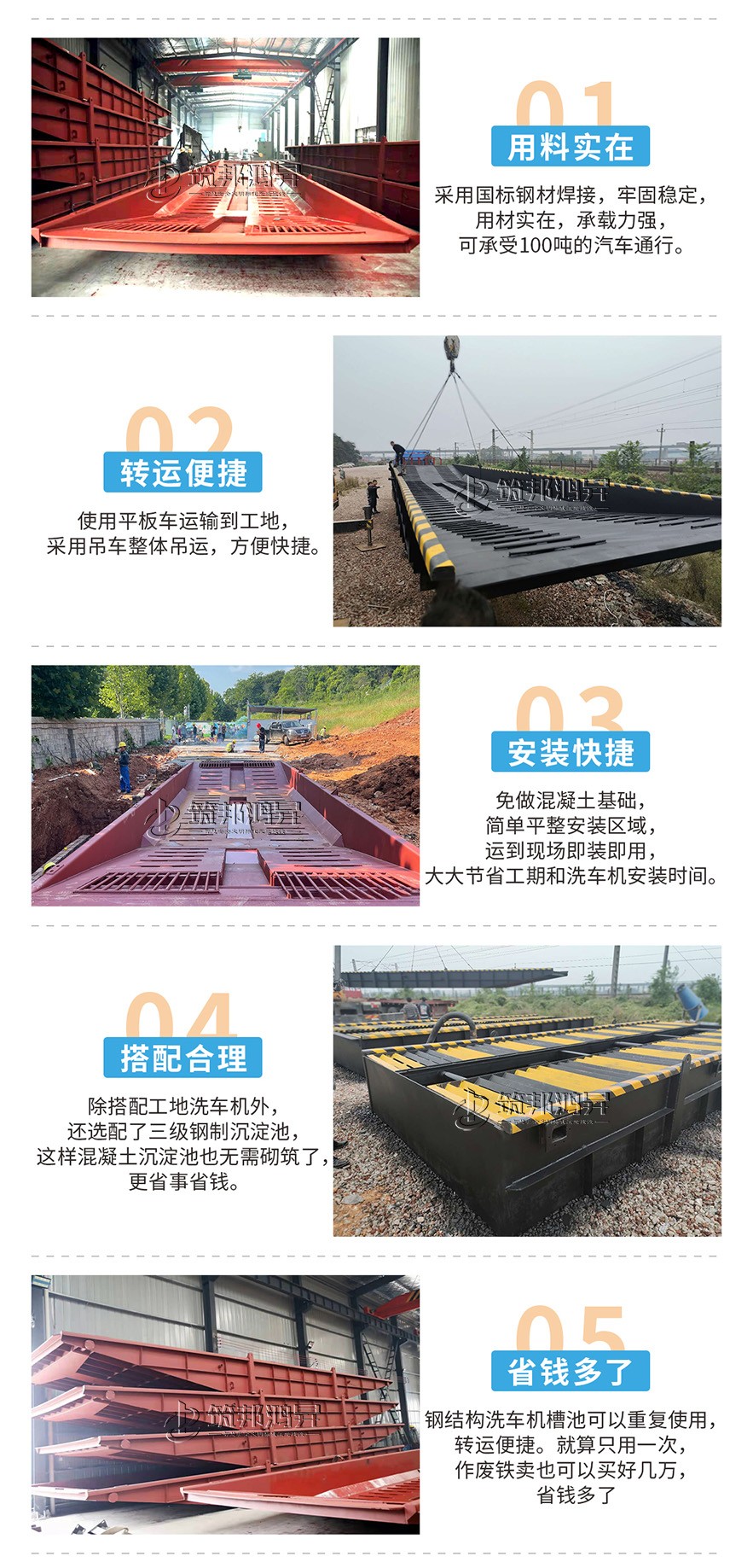 筑邦鴻昇研發(fā)鋼結(jié)構(gòu)洗車槽池采用整體設(shè)計(jì),整體吊運(yùn),用料厚實(shí)。替代了之前的工地洗車機(jī)下面的水泥基礎(chǔ),更加牢固方便,節(jié)省了大量的基礎(chǔ)砌筑人工和材料,還可以重復(fù)使用。如果不需要重復(fù)使用;十幾噸重的洗車槽做廢鐵賣,也能賣好幾萬,大大節(jié)省了施工時(shí)間和成本。鋼結(jié)構(gòu)洗車槽池長度16米,寬度3.5米,高度0.9米,存水深度:0.4米。筑邦鴻昇新開發(fā)的移動(dòng)式多功能工地洗車池工還可以加配工地..
