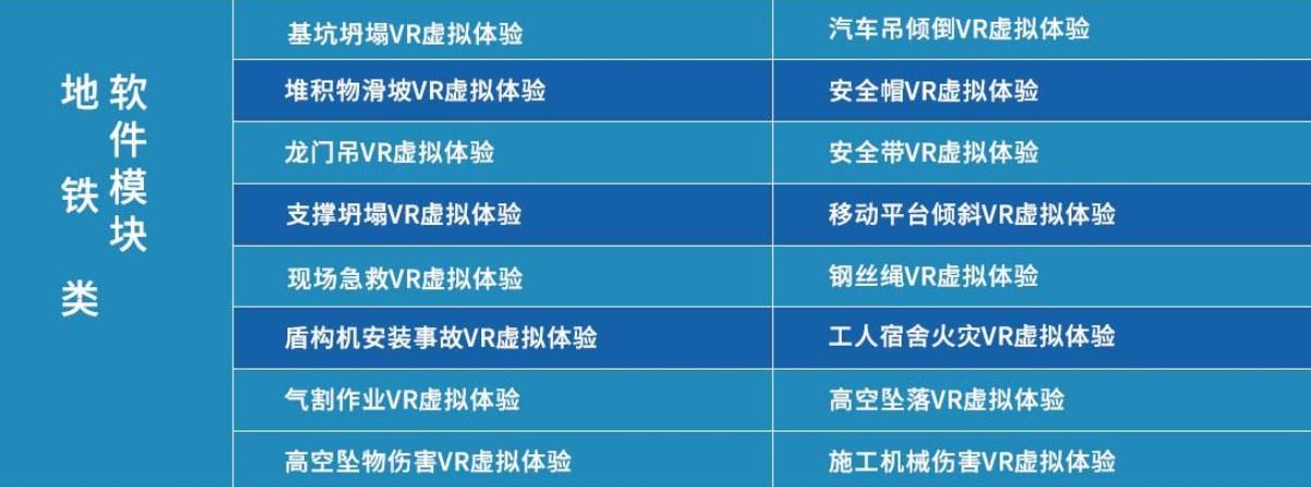 地鐵類(lèi)軟件模塊主要有施工機(jī)械傷害VR體驗(yàn)、氣割傷害VR體驗(yàn)、安全帽撞擊、宿舍火災(zāi)、高空墜物傷害、基坑支撐坍塌、基坑坍塌、現(xiàn)場(chǎng)急救、安全帶使用、汽車(chē)吊側(cè)翻、移動(dòng)平臺(tái)傾倒、安全用電觸電、高空墜落等多個(gè)VR體驗(yàn)項(xiàng)目。